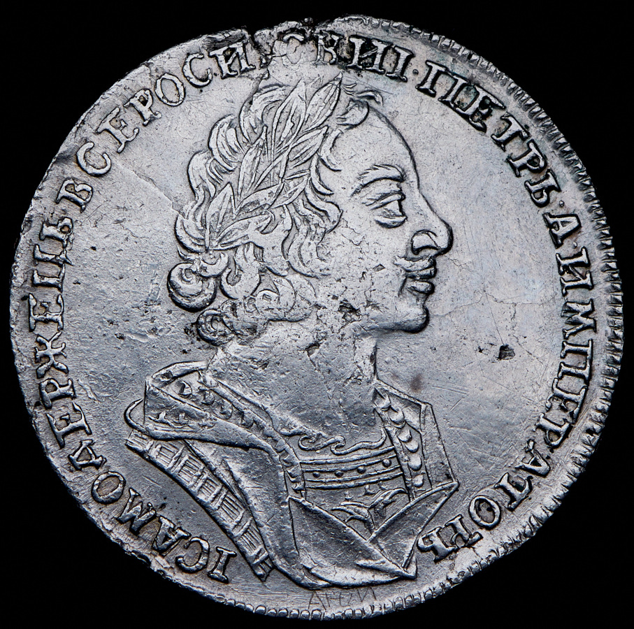 Следы реставрации полей. Граффити "АЮИ" в нижней части аверса, под портретом