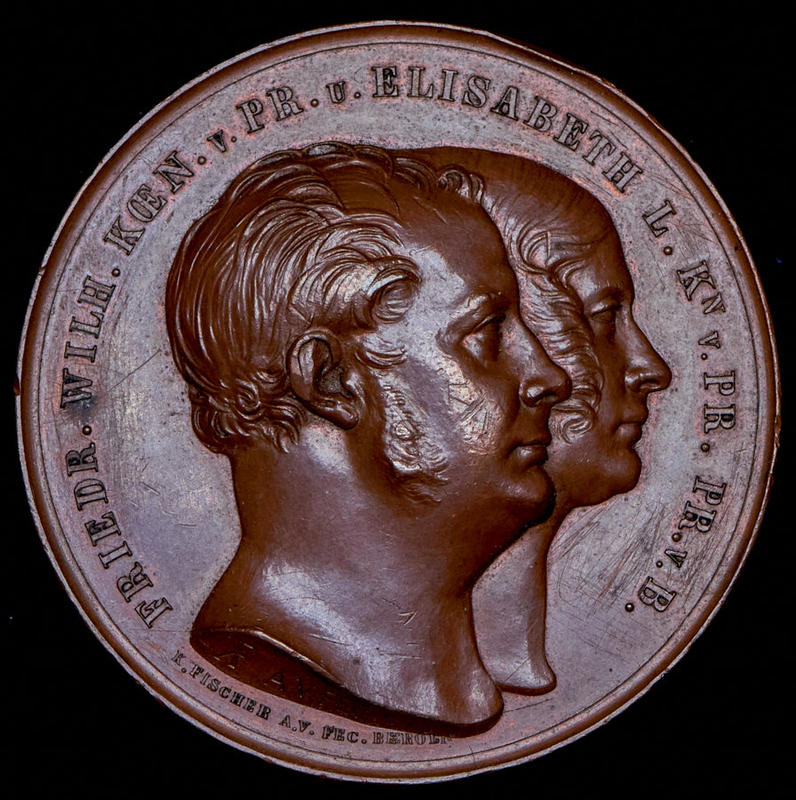 Чеканеная в честь 25-летнего юбилея свадьбы Фридриха Вильгельма IV Прусского и Елизаветы Людовики Баварской.