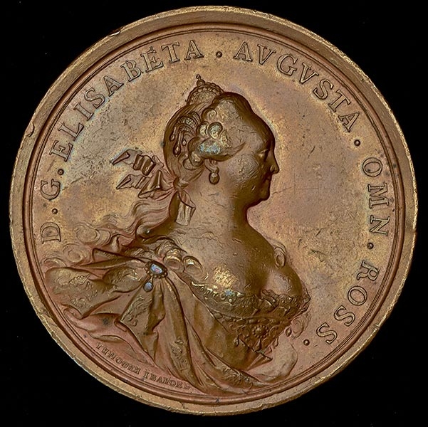 На аверсе бюст императрицы Елизаветы вправо, в короне и мантии. Внизу подпись "ТIМОФЕЙ IВАНОВЪ".