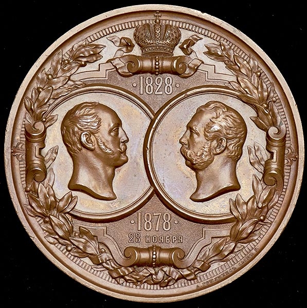 На аверсе внктри венка два медальона с портретами Николая I и Александра II. Вверху под короной дата "1828", внизу "1878 28 НОЯБРЯ". Справа внизу подпись "А. ГРИЛИХЕСЪ СЫНЪ Р." (А. грилихес-сын резал).