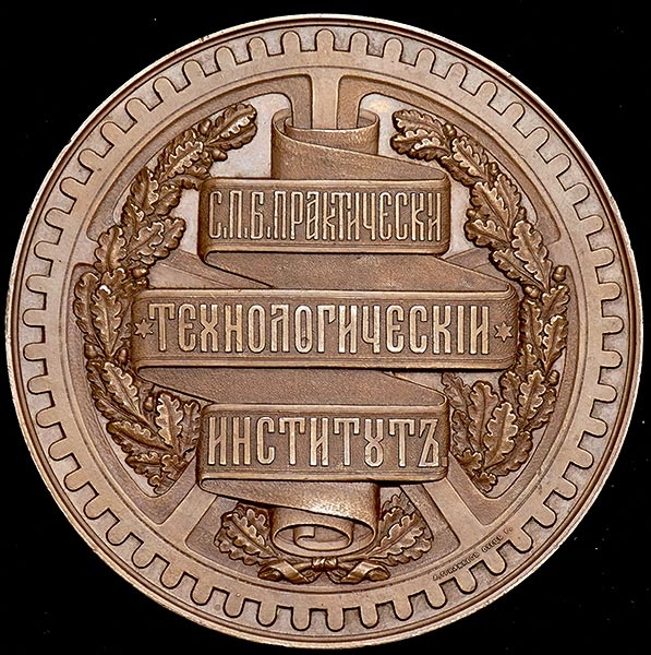 На реверсе внутри венка свернутая спиралью вокруг зубчатого колеса лента с надписью "С.П.Б. ПРАКТИЧЕСКIИ ТЕХНОЛОГИЧСКIИ ИНСТИТУТЪ". Справа внизу "А. ГРИЛИХЕСЪ ОТЕЦЪ Р." (А. Грилихес-отец резал).