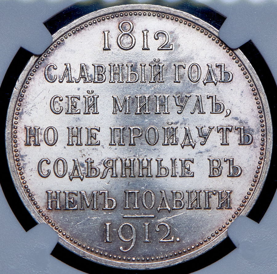 Чеканена в честь 100-летия победы в Отечественной войне 1812 года.