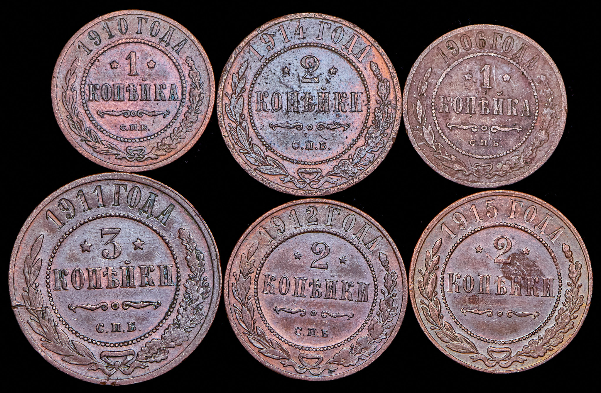 Набор из 6 медных монет 1,2 и 3 копейки 1906-1915