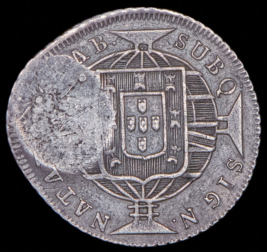 "Piratini" — фантазийная контрмарка, датированная 1835 годом, нанесённая на монету достоинством 320 реалов 1820 года (Бразилия).