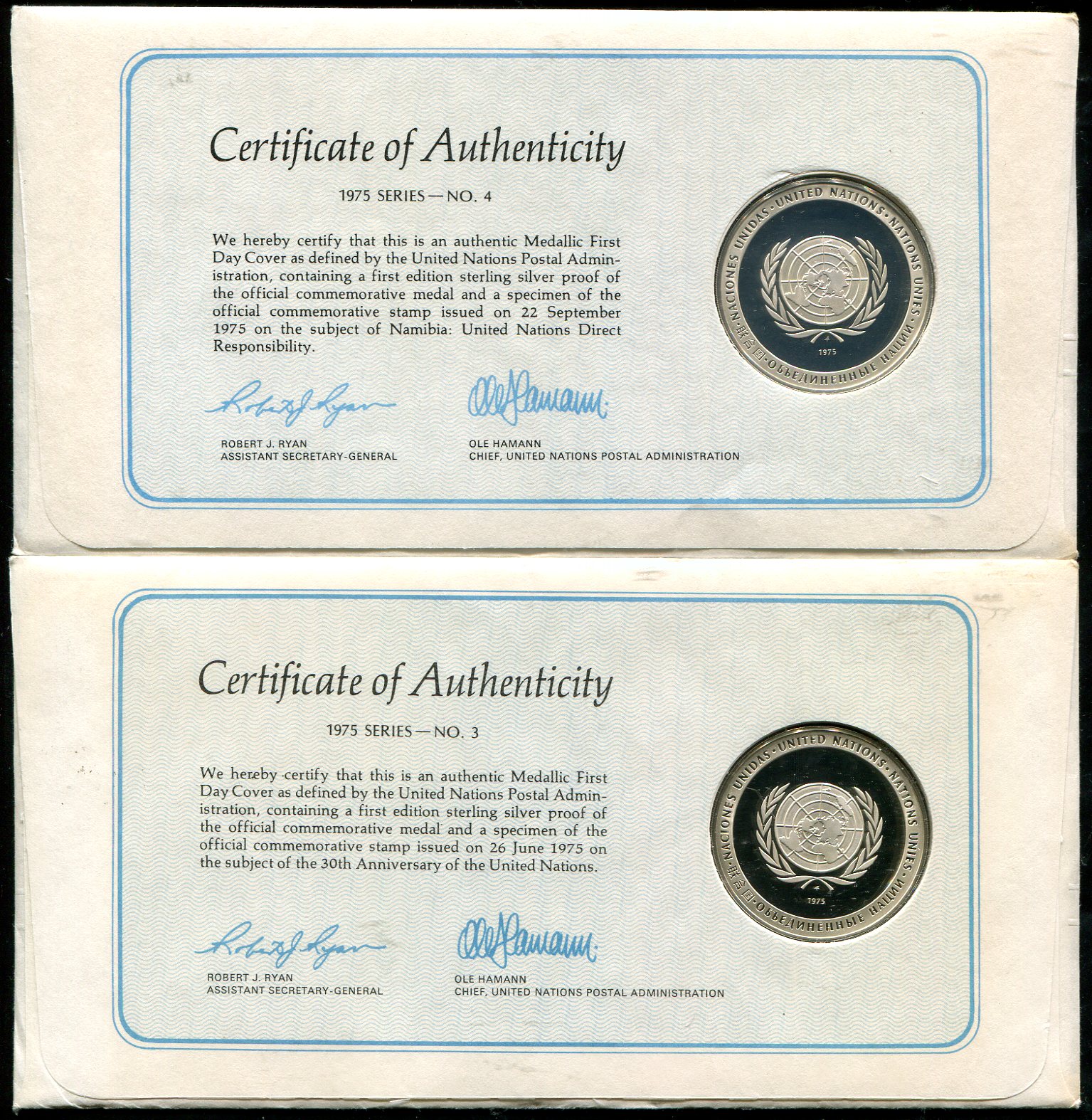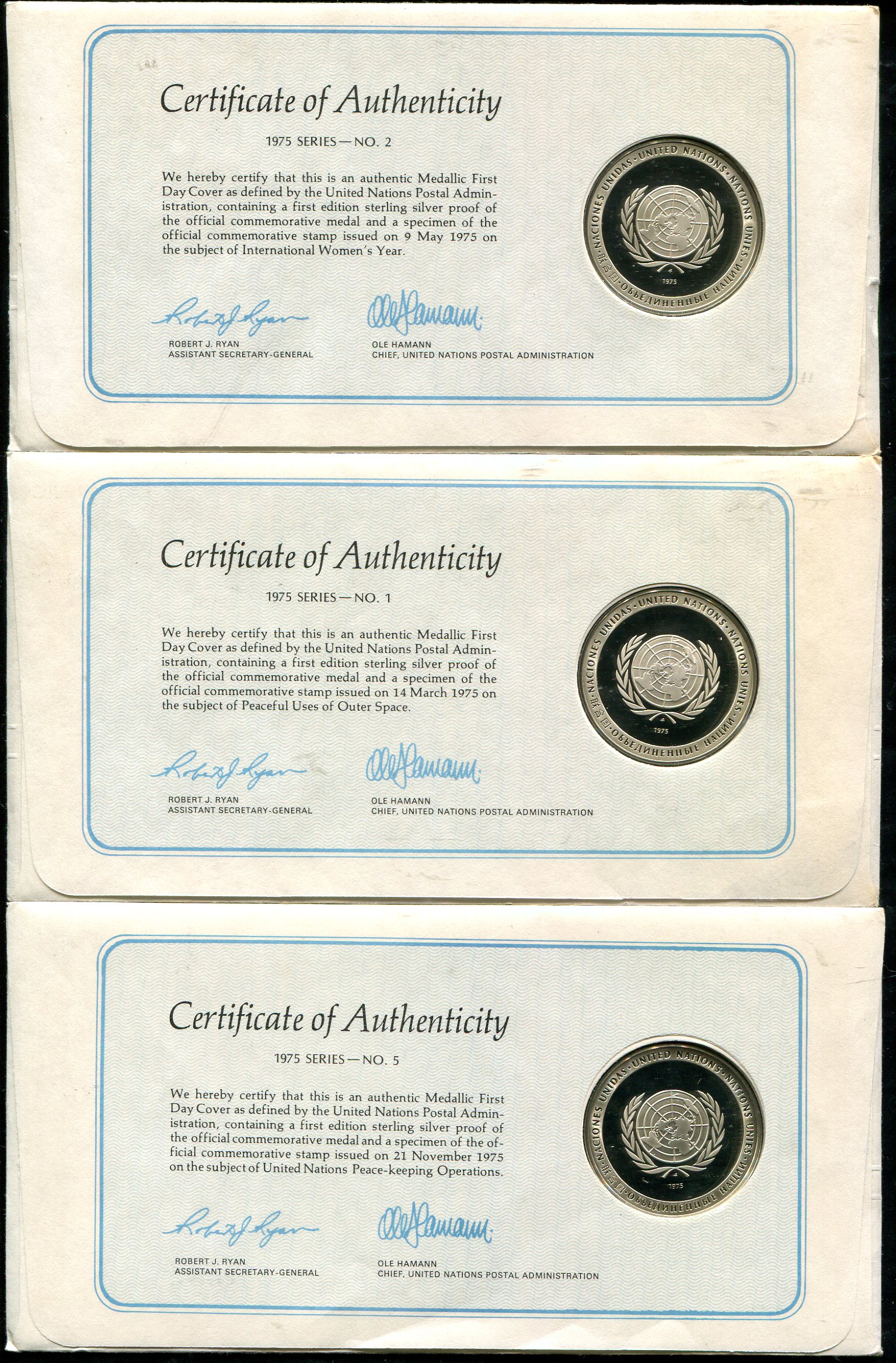Диаметр 39 мм. Масса каждой примерно 24,5 грамма.В конвертах с гашением "first day of issue".