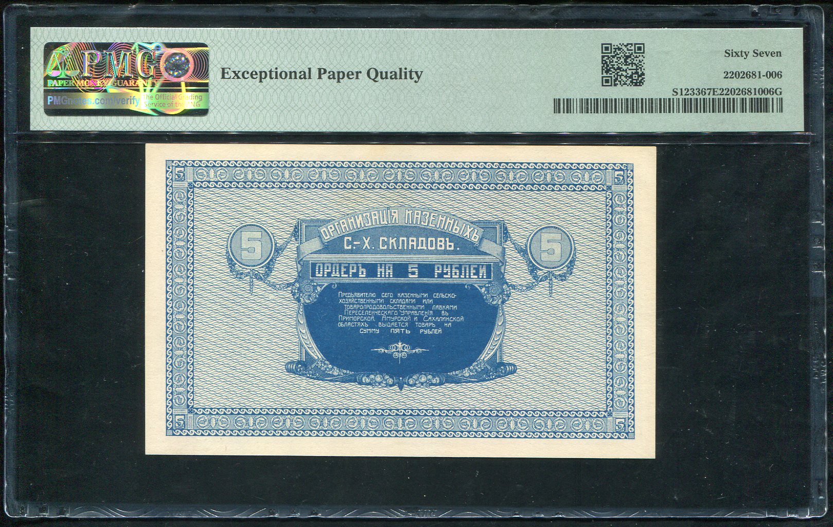 Организация Казенных Сельскохозяйственных складов (Переселенческое Управление в Приморской, Амурской и Сахалинской областях). Ордер 5 рублей 1919 г.