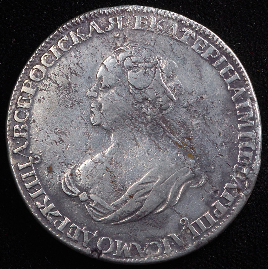Так называемый «траурный» рубль. Санкт-Петербургский монетный двор. С буквой И в слове «самодержИца». Над головой императрицы легенду разделяет точка.