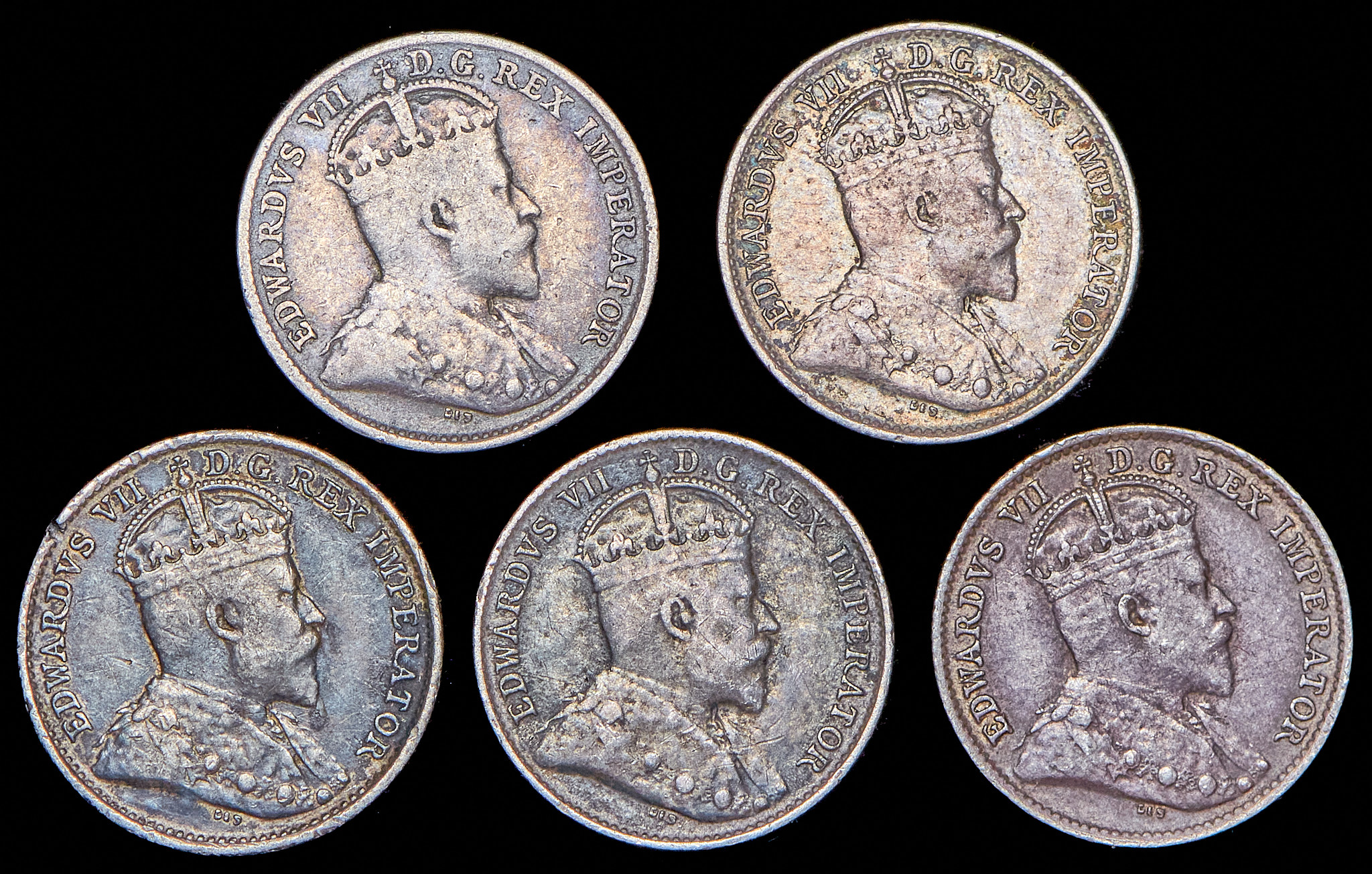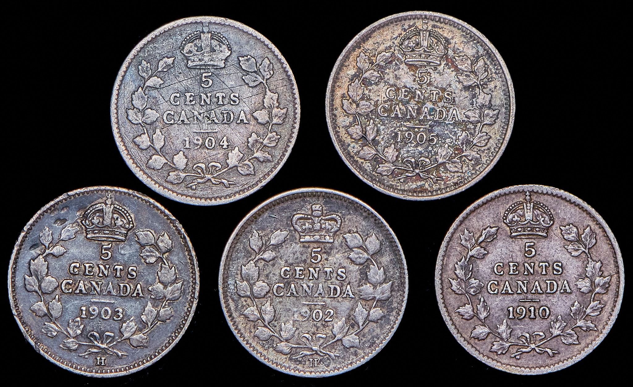 Набор из 5 сер. монет 5 центов 1902-1910 (Канада)