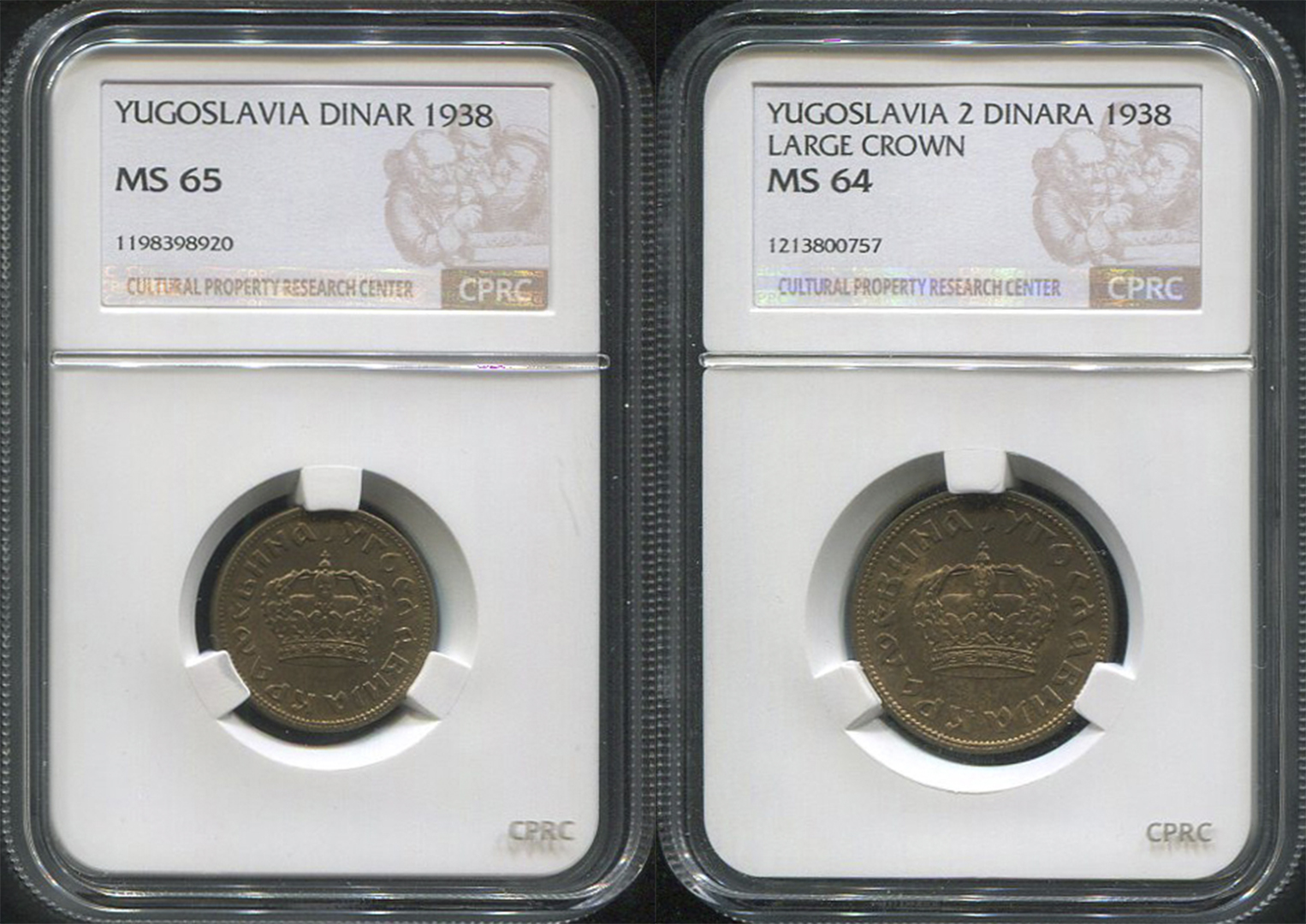 Набор из 2 монет 1 и 2 динара 1938 (Югославия) (в слабах)