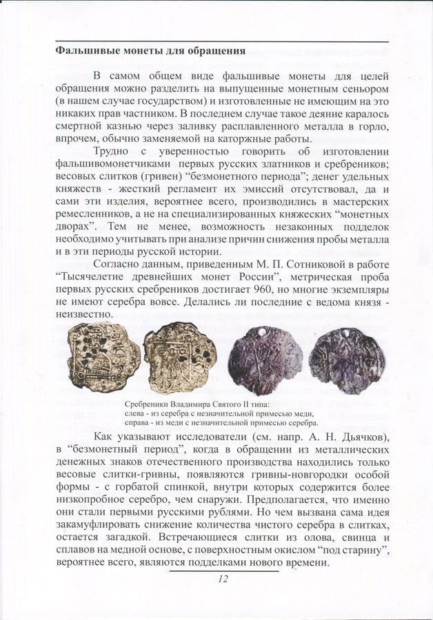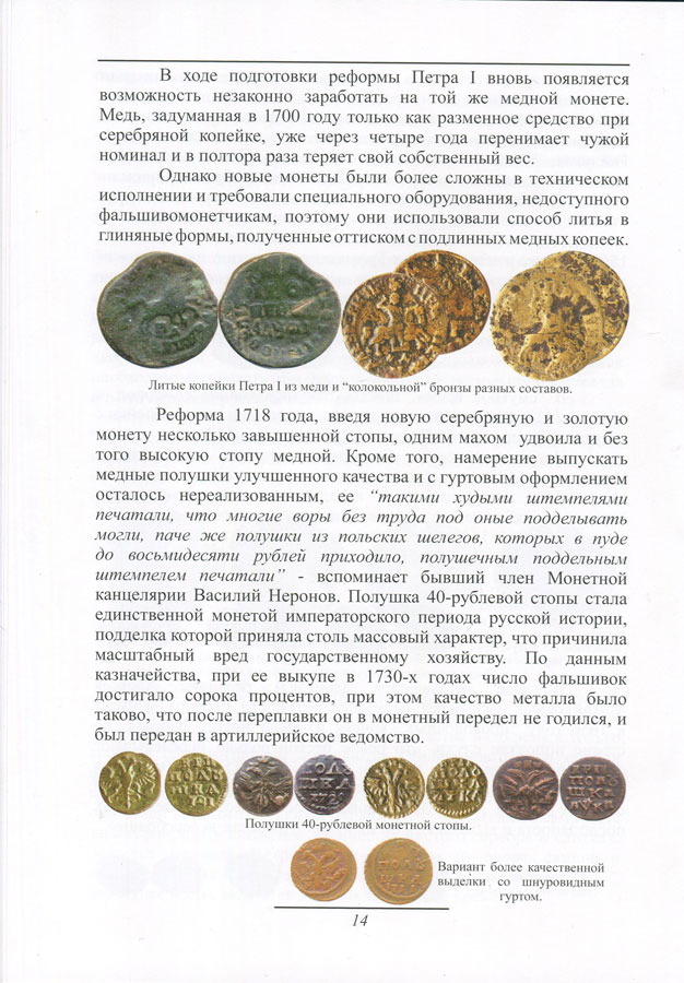 Описывая историю многочисленных подделок, засоривших отечественную нумизматику, автор отмечает неоднозначность многих общепринятых трактовок, в результате которых подлинные монеты попадают в категорию фальшивок, а фальшивые, напротив, остаются не выявленными.