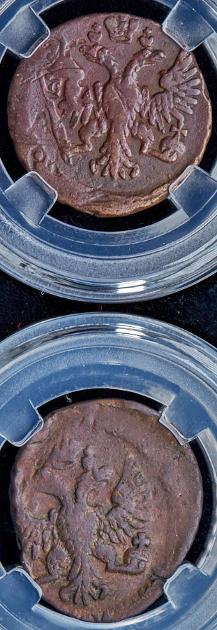 2) Деньга 1743 - 1754 гг. Двойной удар со смещением, инкузный брак. VF det. Коррозия.