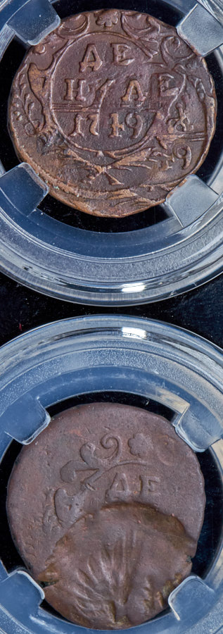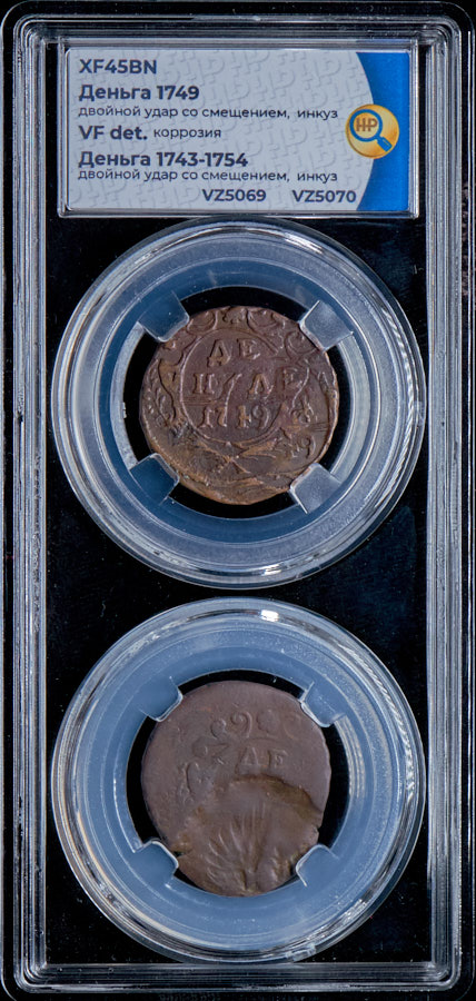 1) Деньга 1749. Двойной удар со смещением, инкузный брак. XF 45 BN.