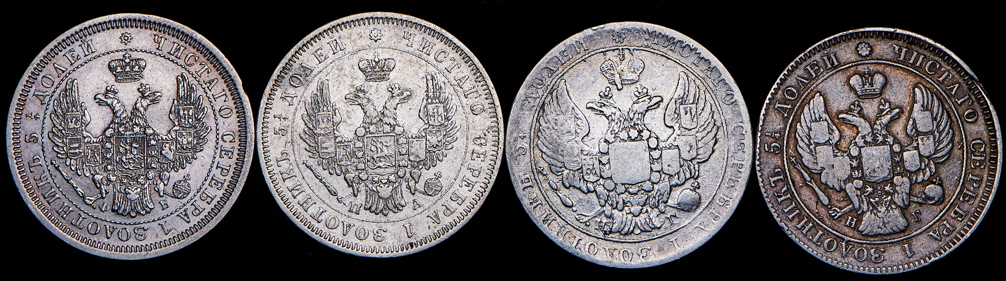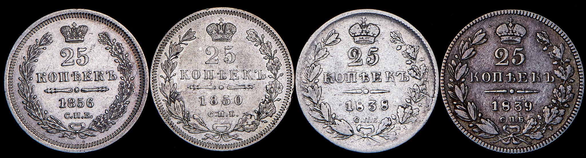 Набор из 4 сер. монет 25 копеек 1838-1856