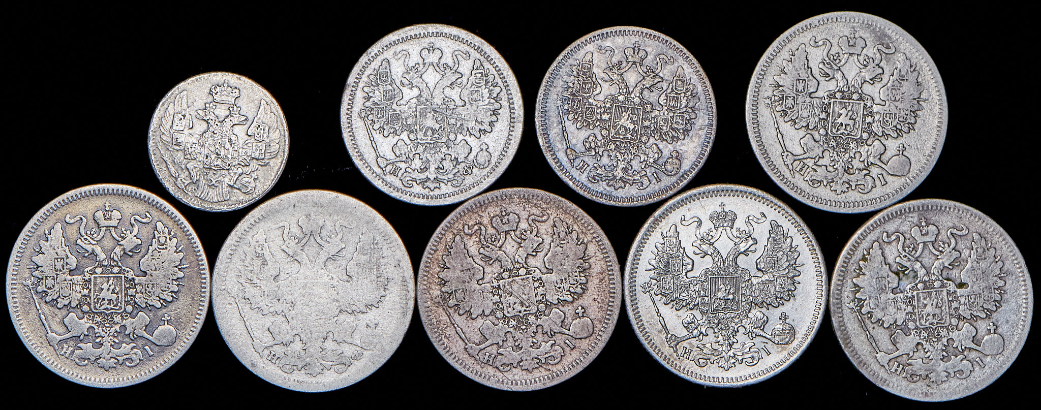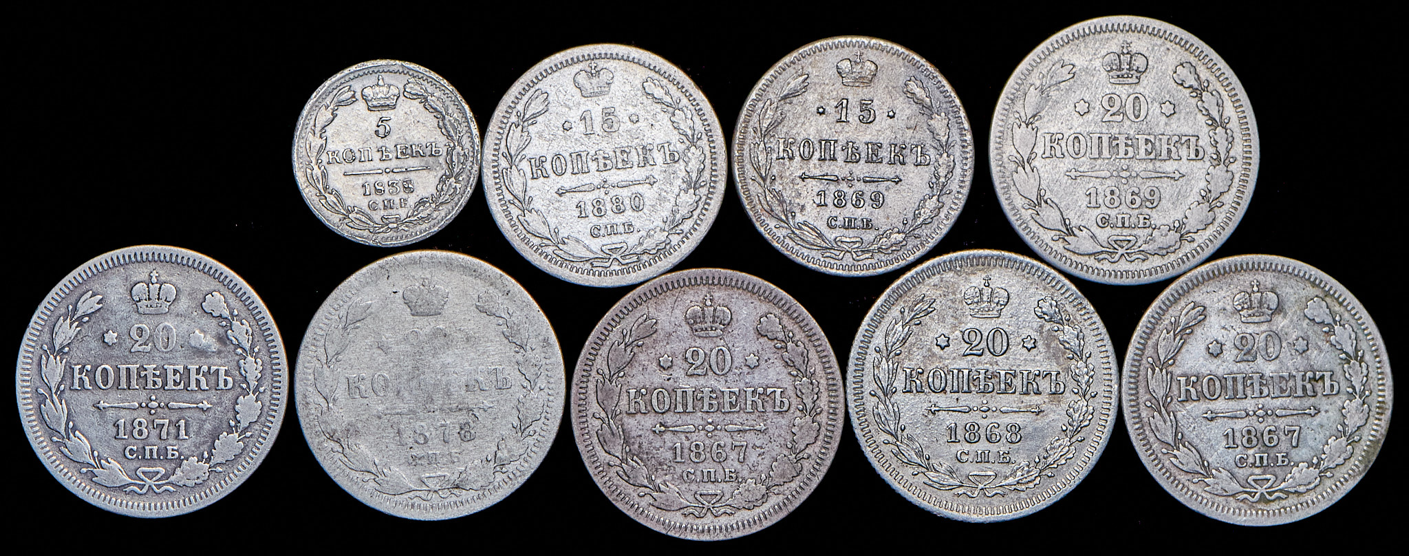 Набор из 9 сер. монет 5, 15, 20 копеек (XIX в.)