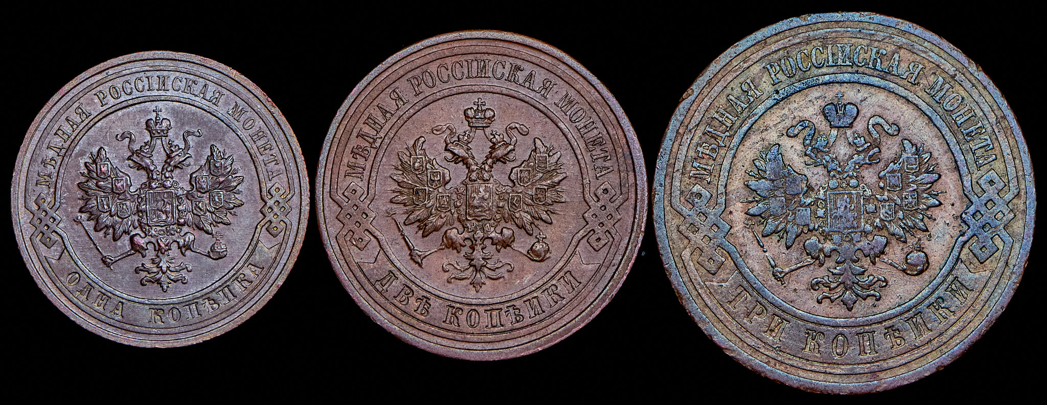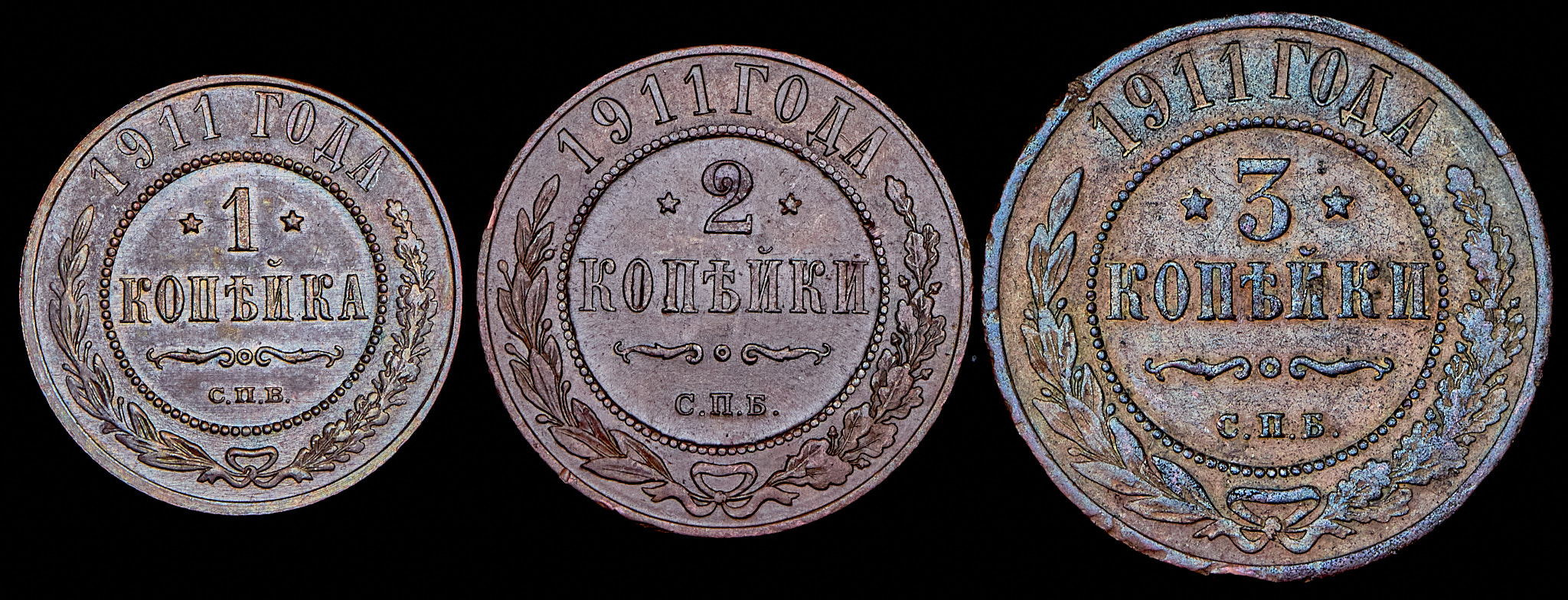 Набор из 3 медных монет 1,2 и 3 копейки 1911 СПБ
