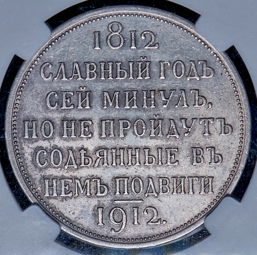 Чеканена в честь 100-летия победы в Отечественной войне 1812 года.