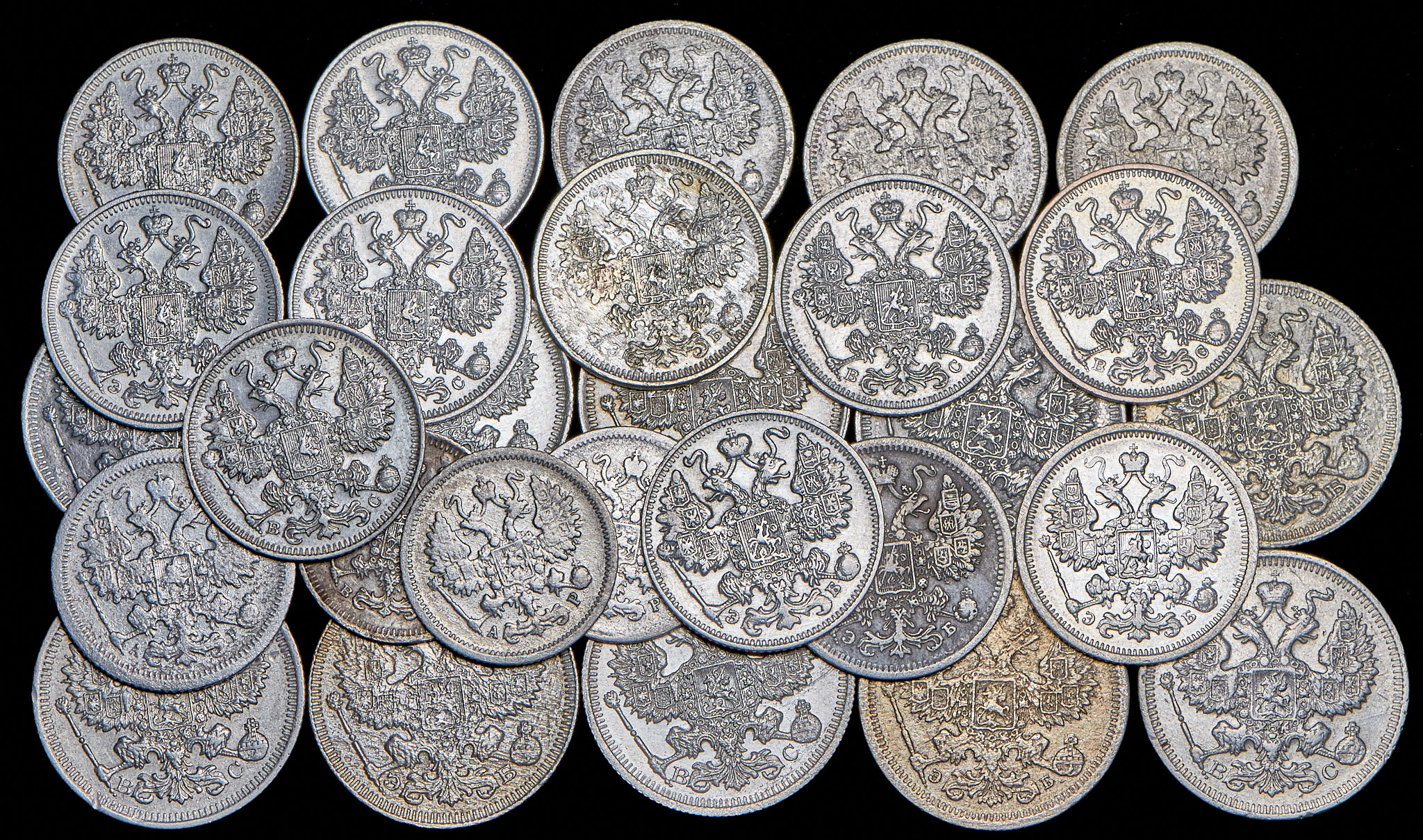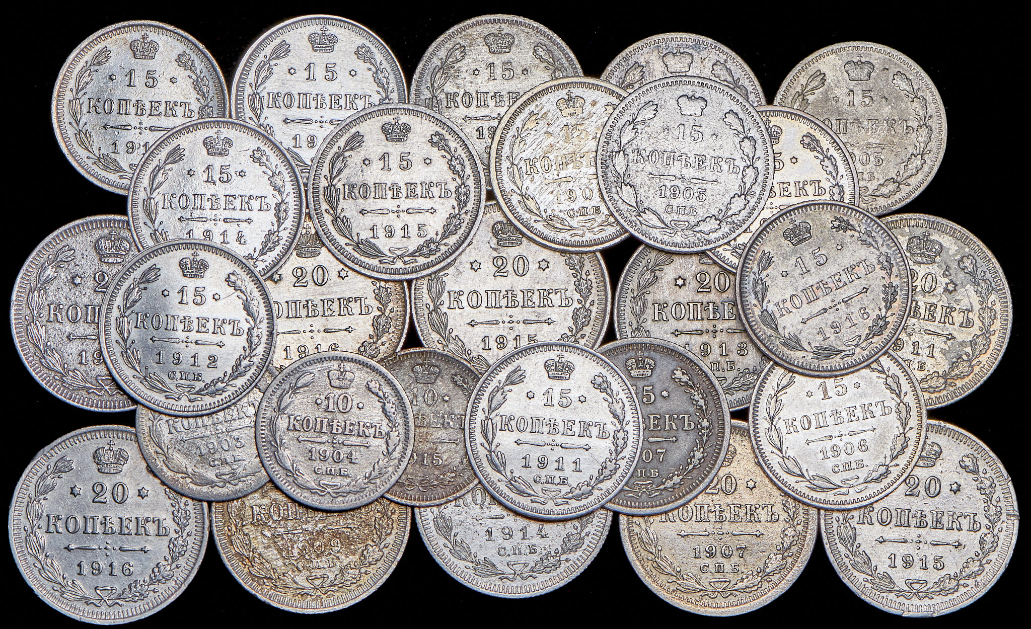 Набор из 28 сер. монет 10, 15, 20 копеек (Николай II)