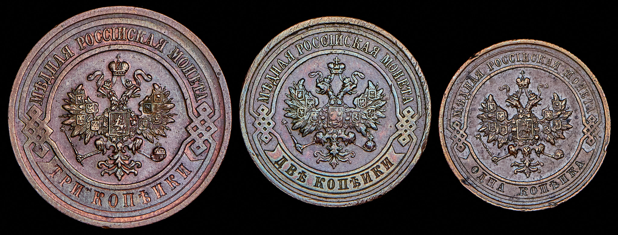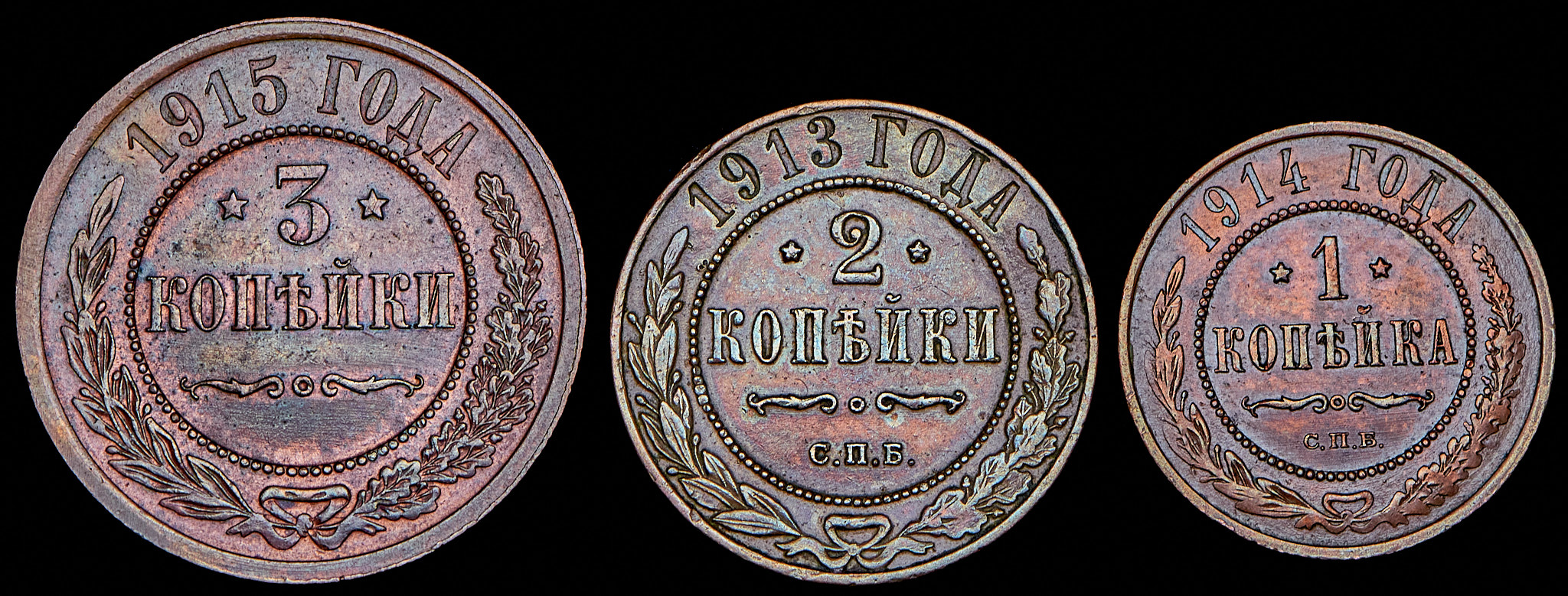 Набор из 3 медных монет 1, 2 и 3 копейки 1913-1915