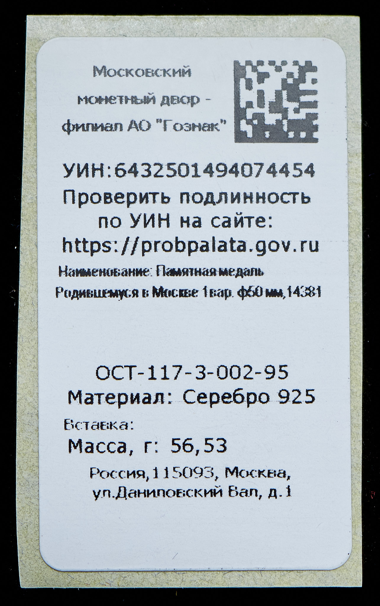 Медаль "Родившемуся в Москве" 2016 (в п/у)