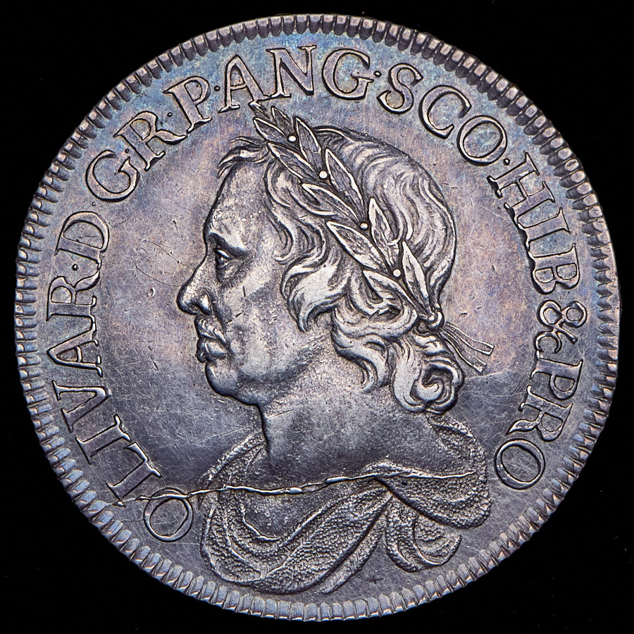 Легенда аверса "OLIVAR·D·G R·P·ANG·SCO·HIB & PRO" (Оливер, милостью божьей защитник Республики Англия, Шотландии, Ирландии и т.д.).
