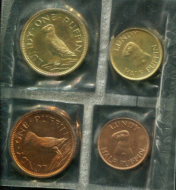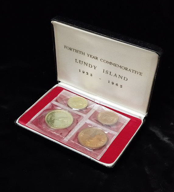 Монеты в запайке и оригинальной подарочной коробочке с надписью "FORTIETH YEAR COMMEMORATIVE / LUNDY ISLAND / 1925 - 1965" (В память 40-летия).