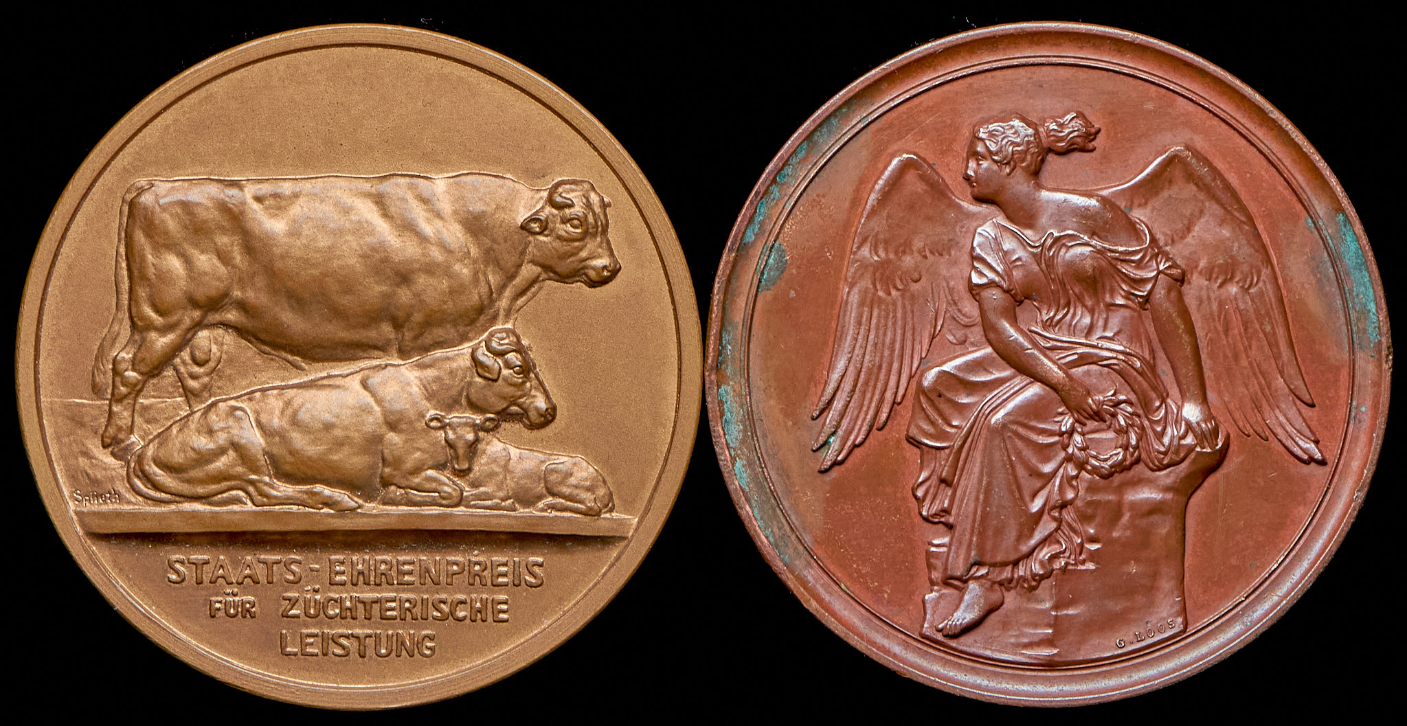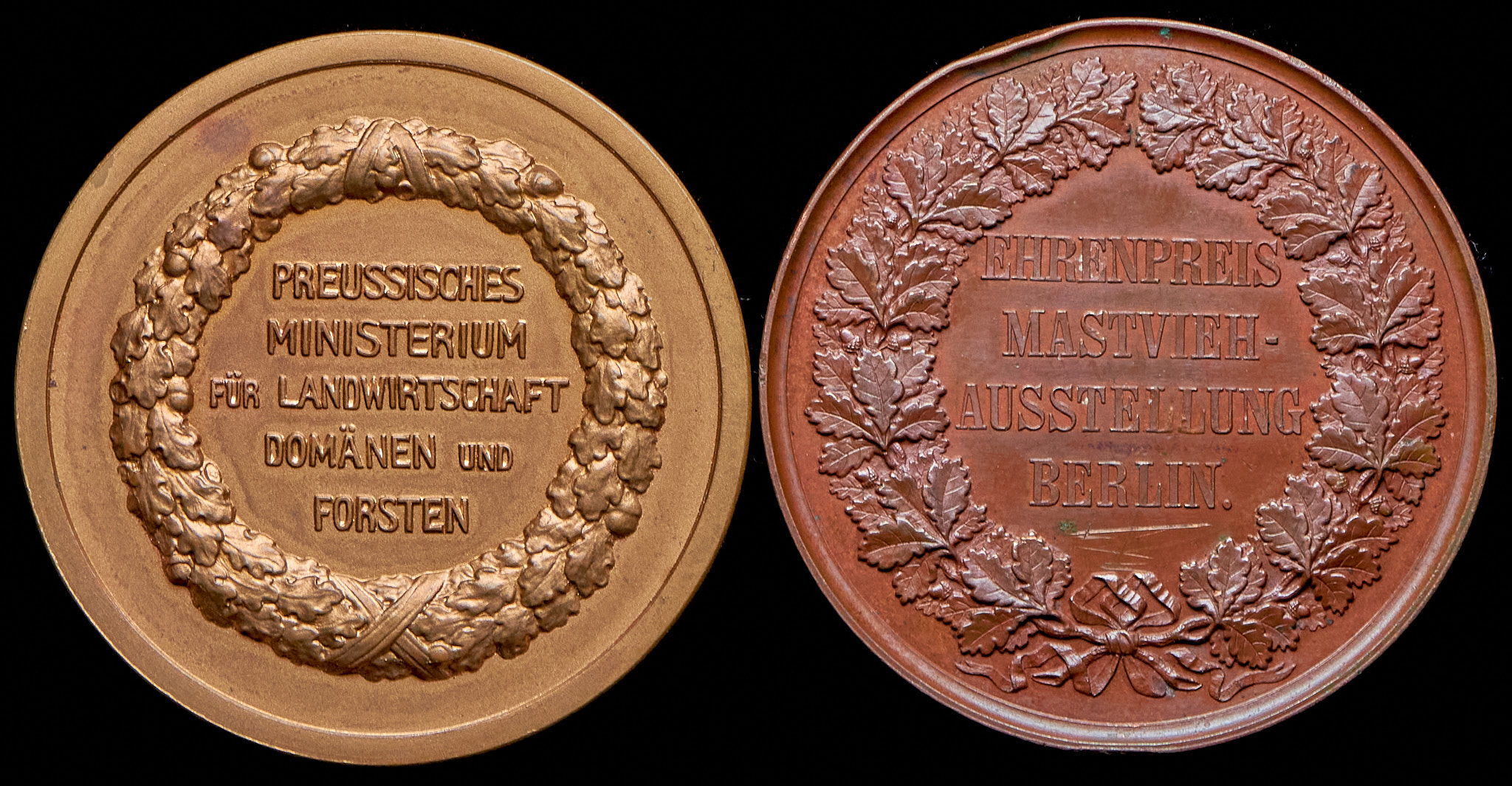 1) Медаль "За успехи в разведении крупного рогатого скота". Берлин, вторая половина XIX века. Диаметр 50 мм.