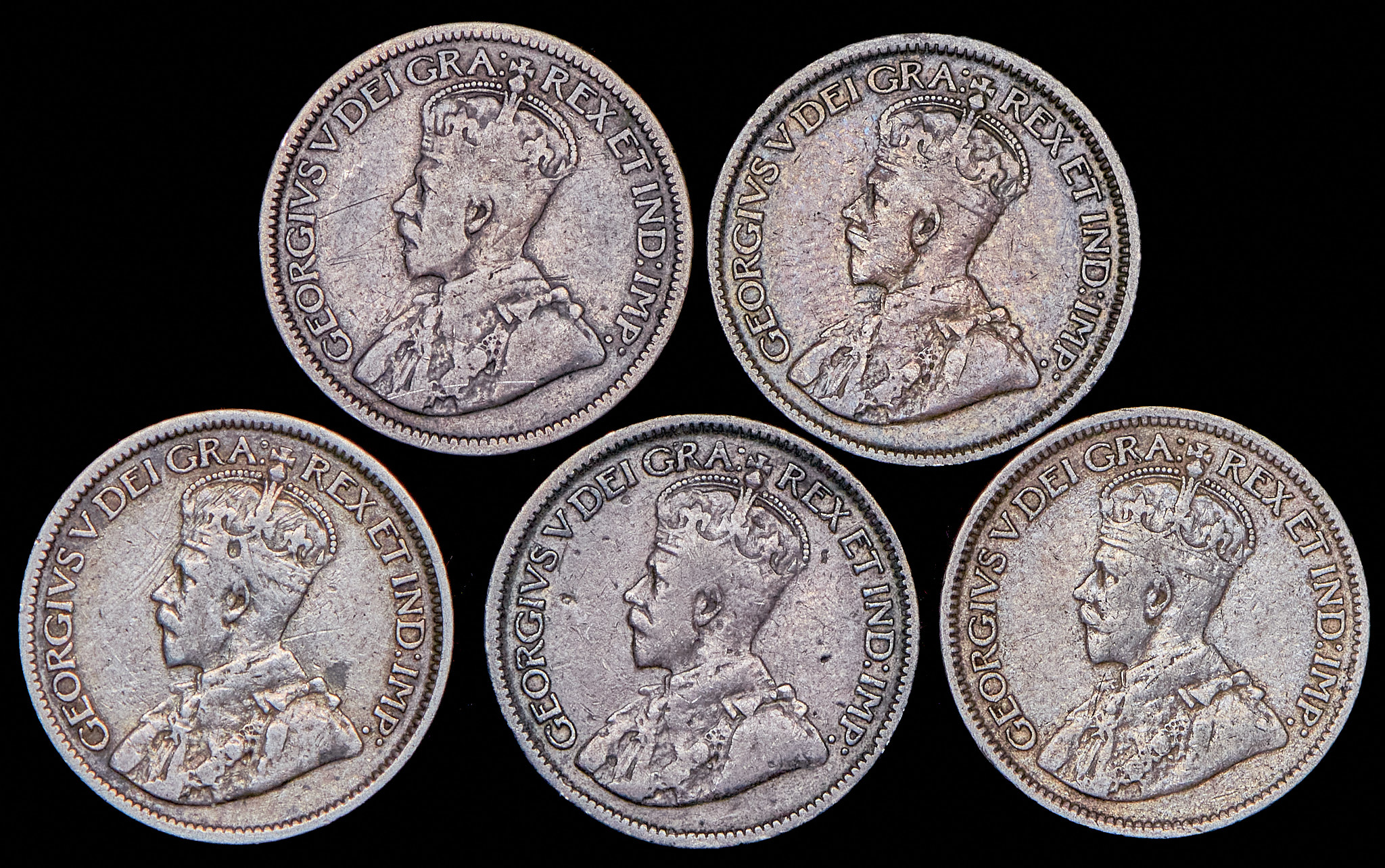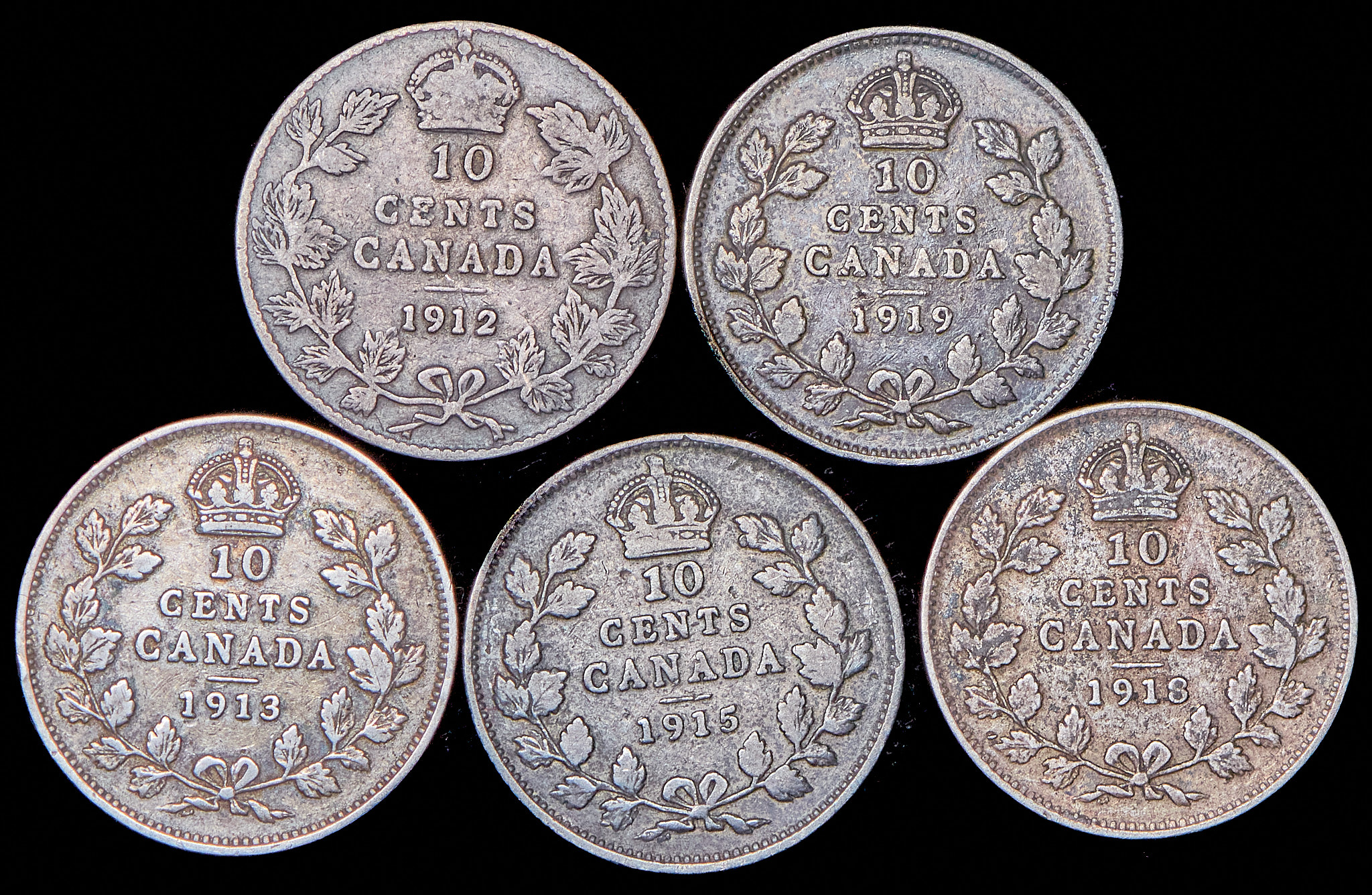 Набор из 5 сер. монет 10 центов 1912-1919 (Канада)