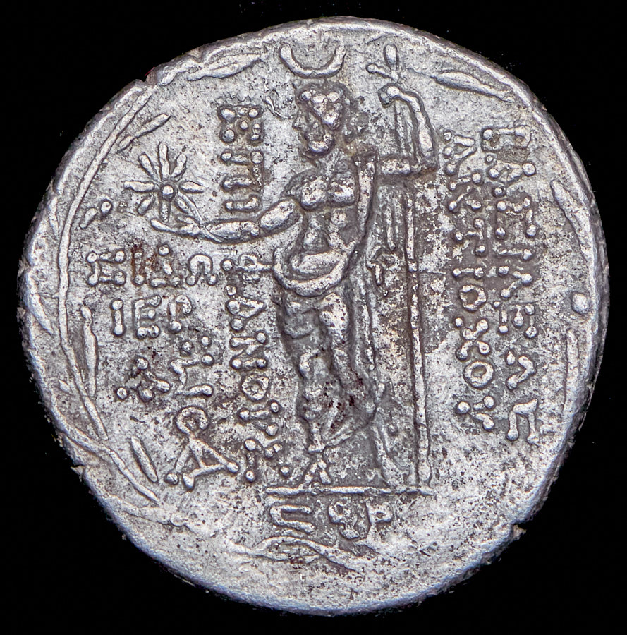 Легенда реверса "BAΣIΛEΩΣ / ANTIOXOY — EΠIΦANOYΣ". Изображен Зевс анфас, голова влево, в правой руке он держит звезду, а в левой - длинный скипетр; над ним - полумесяц; всё изображение в лавровом венке.
