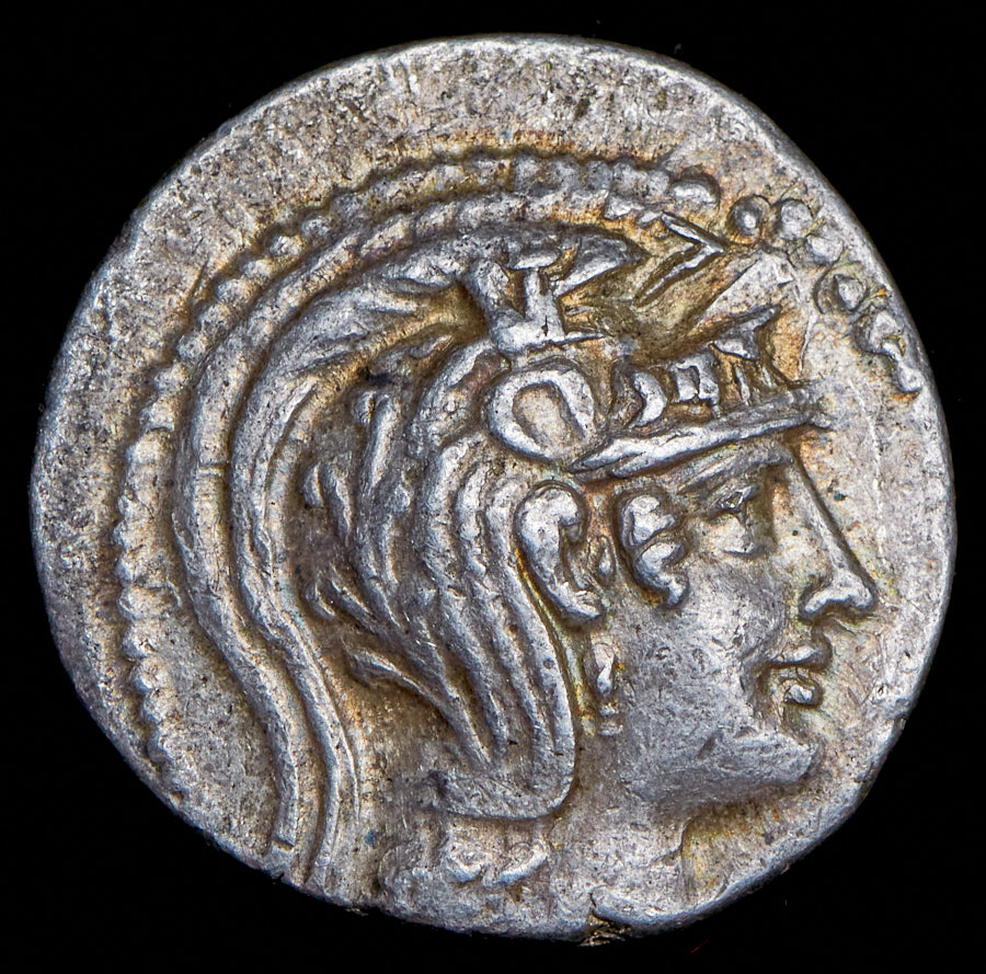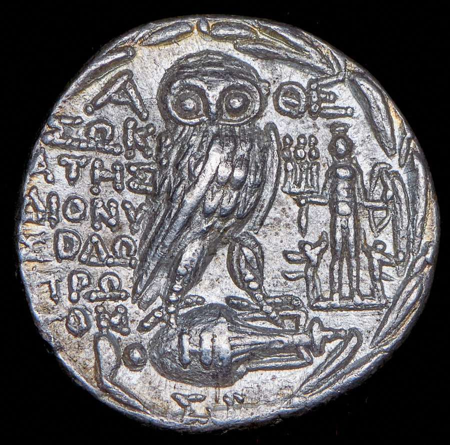 Аверс: голова Афины в тройном аттическом шлеме с гребнем, украшенном пегасами и растительным орнаментом вправо. Реверс: "Α - ΘΕ / ΣΩKΡ / ATHΣ / ΔIONY / ΣOΔΩ / TPΩ / TOM" Сова стоит вправо на амфоре; справа — Аполлон Делийский, стоящий влево, с тремя грациями и луком; H на амфоре, ΣΩ внизу; все в венке.