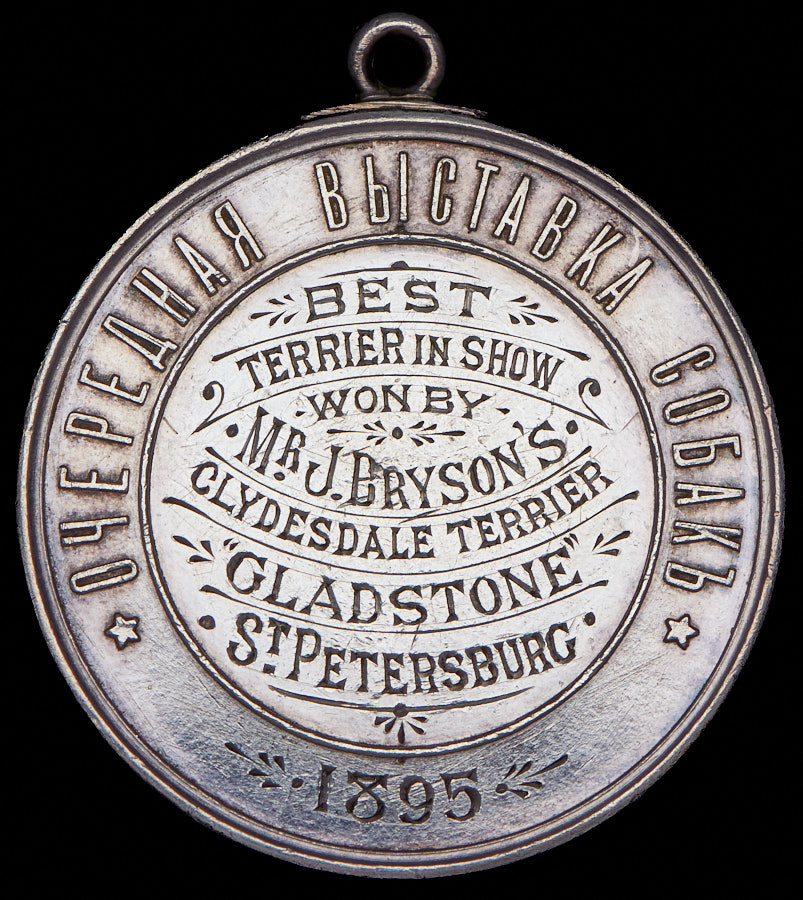 На реверсе гравированная надпись победителю конкурса "Лучший терьер".