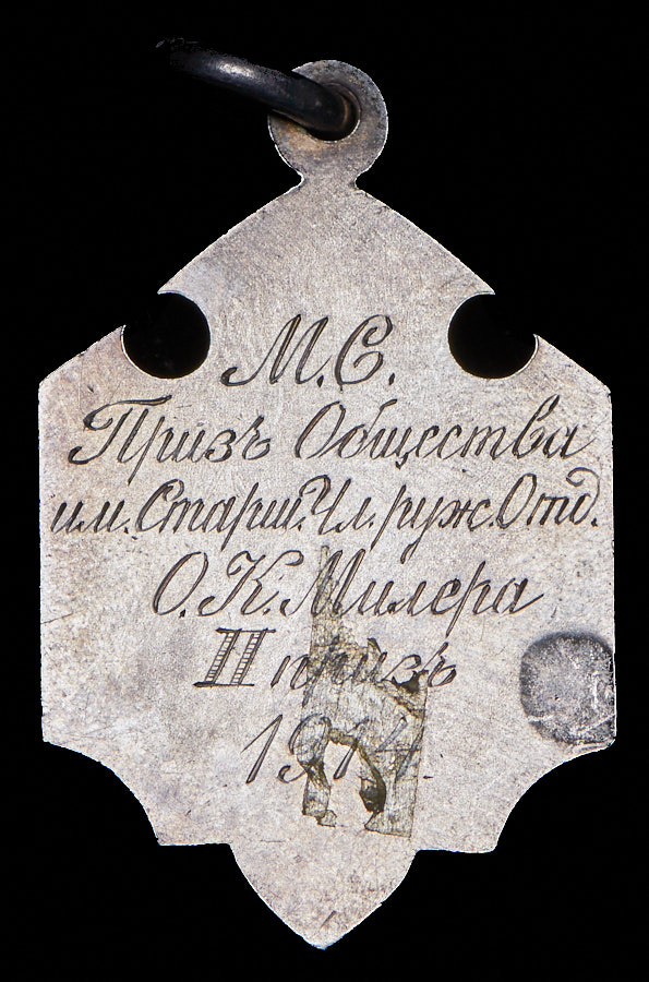 На обороте гравированная надпись: "М.С. Призъ общества им. Старш. Чл. Руж. Отд. О.К. Милера". Неизвестная мастерская.
