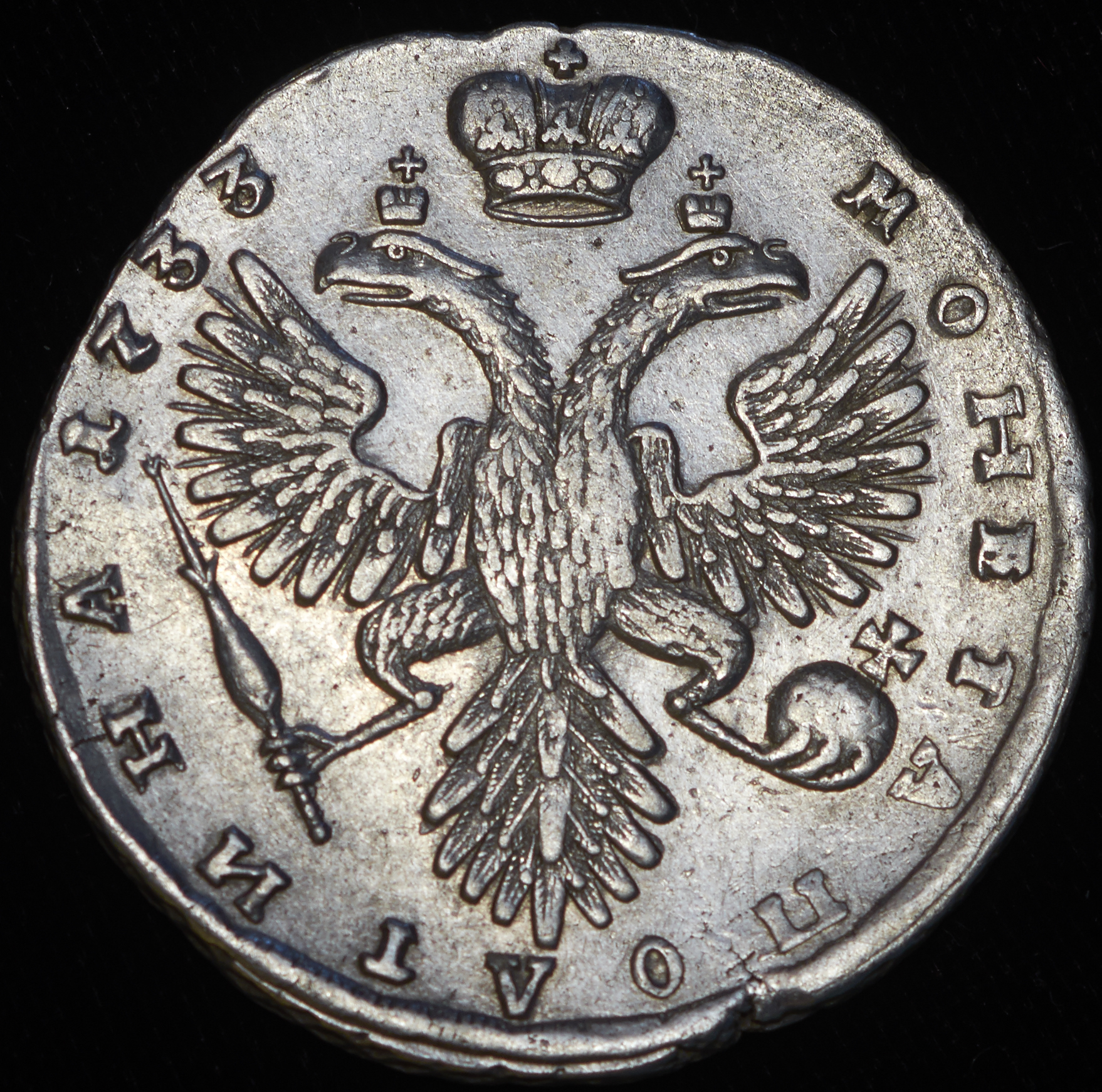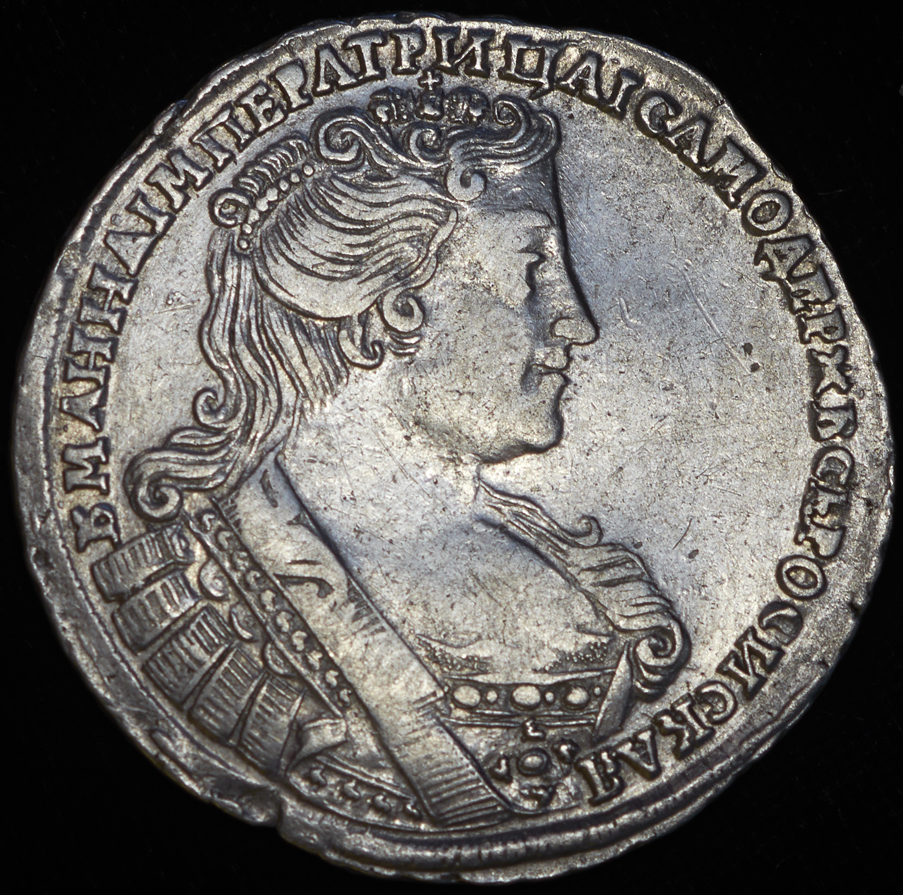 Кадашевский монетный двор. Тип 1731-32 гг., большая голова. Крест державы простой, малые короны орла с крестами. Скипетр с трилистником.