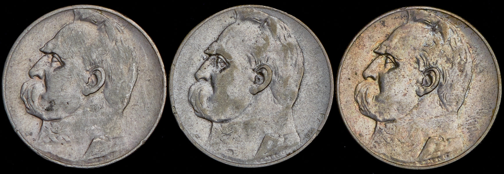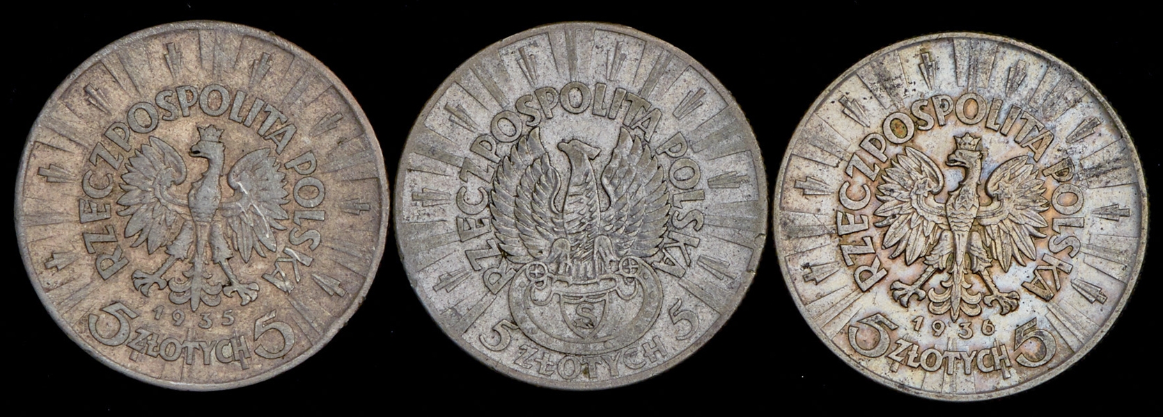 В набор вошли 3 серебряные монеты 5 злотых 1935-1936 гг.