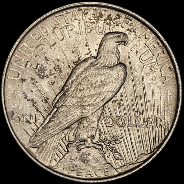 Первоначально Антонио де Франчиски планировал поместить на реверсе белоголового орлана — геральдический символ США, держащего в когтях разломанный меч. Однако такое изображение могло символизировать также и поражение. В связи с этим гравёр Морган заменил меч на оливковую ветвь, которая сама по себе символизирует мир. Орёл сидит на скале, на которой находится надпись «PEACE». Благодаря ей, монета получила своё название «мирного доллара».