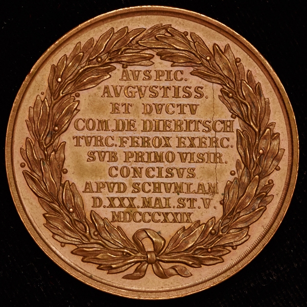 Надпись на об. ст. медали в 10 строк: «AVSPIC. / AVGVSTISS. / ET DVCTV / COM.DE DIEBITSCH / TVRC.FEROX EXERC. / SVB PRIMO VISIR. / CONCISVS / APVD SCHVMLAM / D.XXX.MAI.ST.V. / MDCCCXXIX» (Под высочайшим руководством и предводительством графа Дибича свирепое турецкое воинство под начальством верховного визиря истреблено под Шумлой 30 мая ст. ст. 1829 г.).