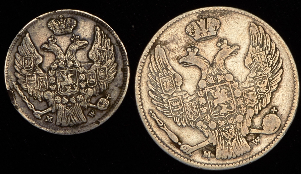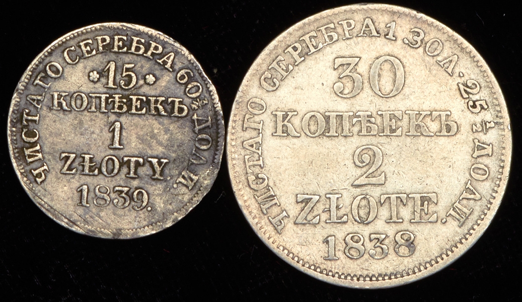 В набор вошли: 1) 30 копеек - 2 злотых 1838 г. 2) 15 копеек - 1 злотый 1839 г.