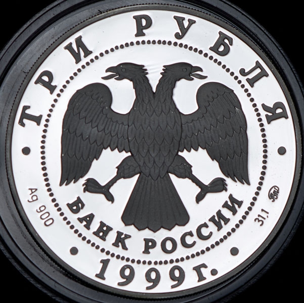 Аверс: Вверху вдоль канта номинал «ТРИ РУБЛЯ», внизу слева химическое название «Ag» и проба «900» металла, внизу по центру год выпуска «1999 г.», внизу справа чистый вес находящегося в монете драгоценного металла «31,10» и монограмма монетного двора «ММД». В середине в ободке из точек двуглавый орел под ним с внутренней стороны точечного ободка слова «БАНК РОССИИ».