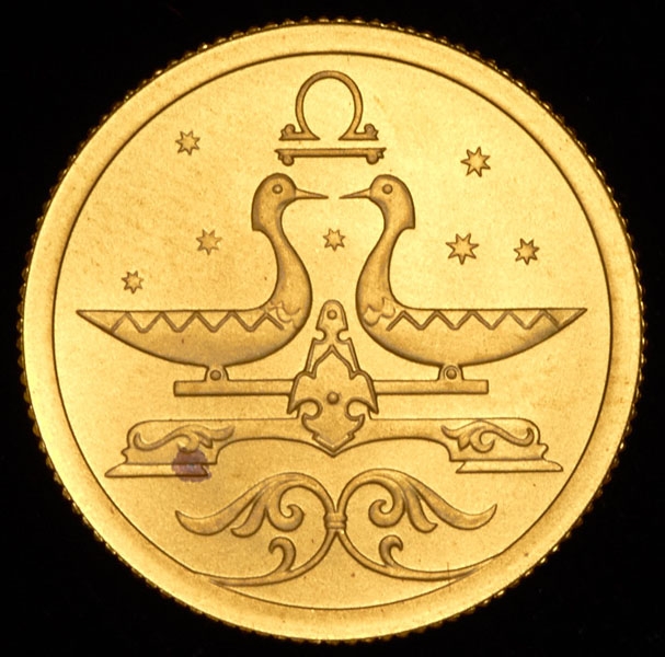 Реверс: Изображение весов на фоне звезд, стилизованных ветвей растений и знака зодиакального созвездия Весов.