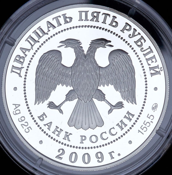 Аверс: Вверху вдоль канта номинал «ДВАДЦАТЬ ПЯТЬ РУБЛЕЙ», внизу слева химическое название «Ag» и проба «925» металла, внизу по центру год выпуска «2009 г.», внизу справа чистый вес находящегося в монете драгоценного металла «155,50» и монограмма монетного двора «ММД». В середине в ободке из точек двуглавый орел под ним с внутренней стороны точечного ободка слова «БАНК РОССИИ».