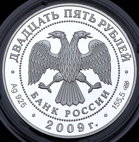 Аверс: Вверху вдоль канта номинал «ДВАДЦАТЬ ПЯТЬ РУБЛЕЙ», внизу слева химическое название «Ag» и проба «925» металла, внизу по центру год выпуска «2009 г.», внизу справа чистый вес находящегося в монете драгоценного металла «155,50» и монограмма монетного двора «СПМД». В середине в ободке из точек двуглавый орел под ним с внутренней стороны точечного ободка слова «БАНК РОССИИ».