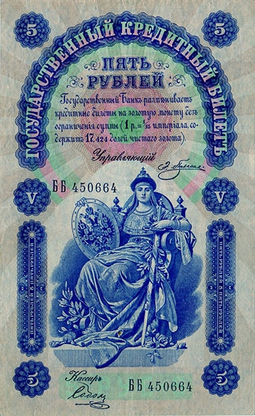 Государственный кредитный билет 5 рублей образца 1898 года, ББ 450664. Подпись Плеске.