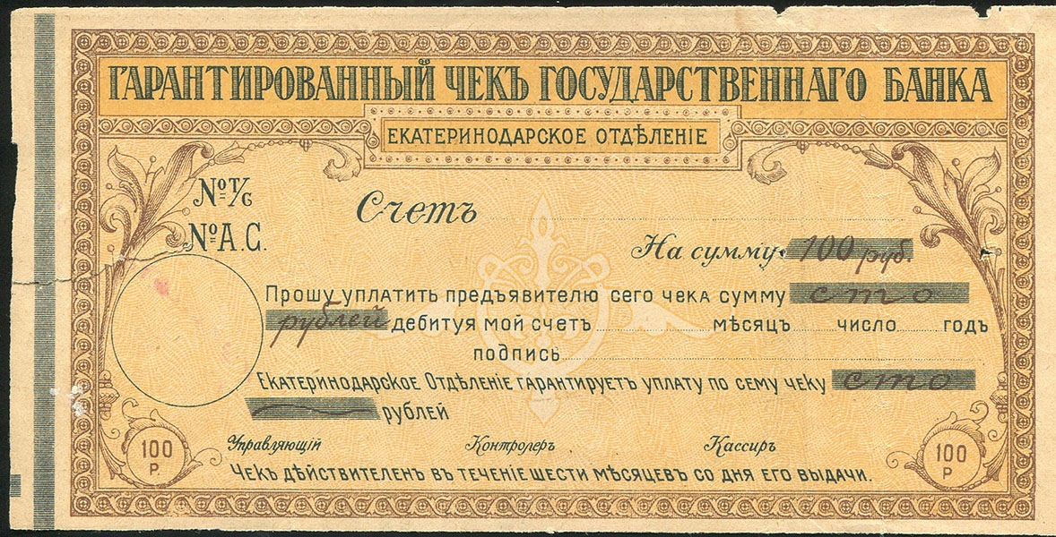 Гарантированный чек Государственного банка Екатеринодарского отделения.