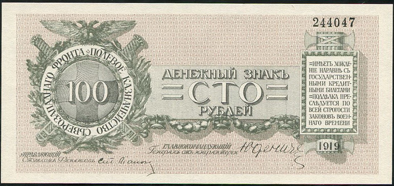 Денежный знак 100 рублей Полевого казначейства Северозападного фронта, 244047.