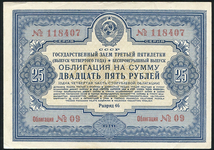 Облигация на 25 рублей Государственного заема третьей пятилетки (выпуск четвертого года), Разряд 46, №09 №118407.