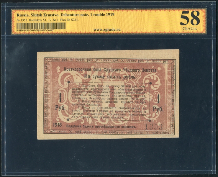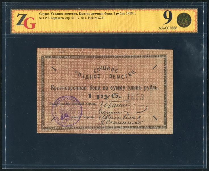 Краткосрочная бона на сумму 1 рубль, 1919 г., Слуцкое уездное земство, 1353. В слабе ZG ChAUnc 58.