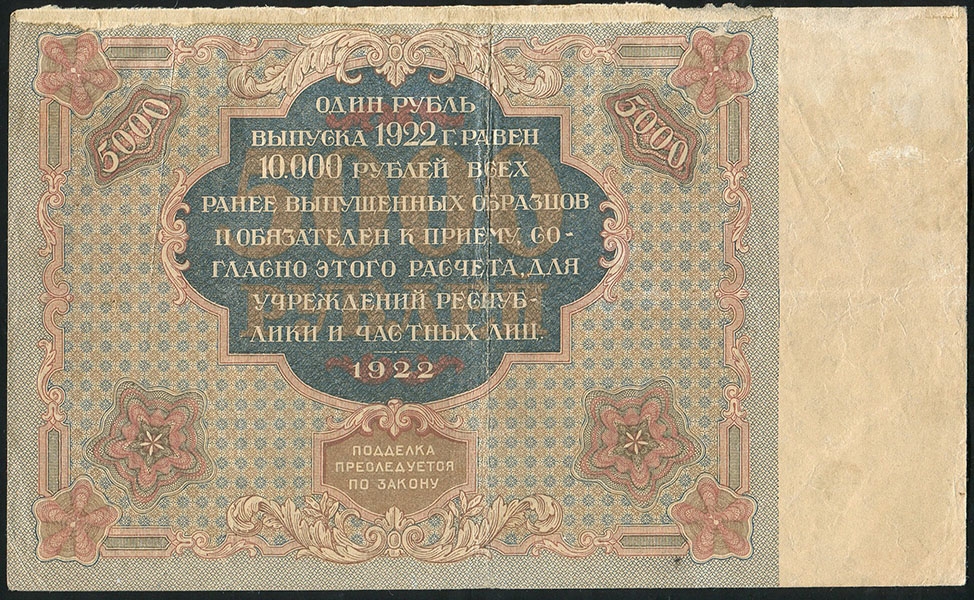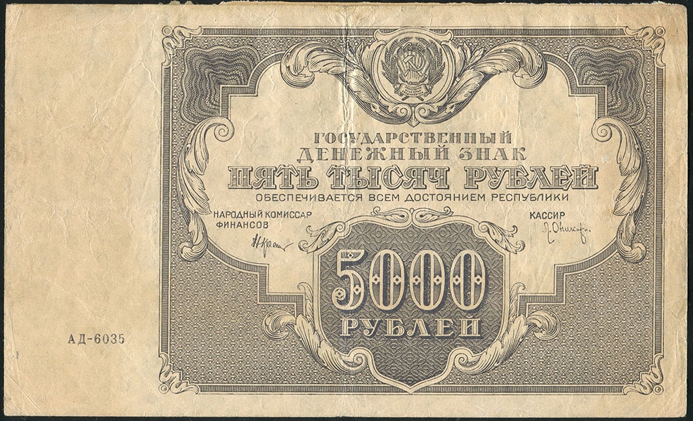 Государственный денежный знак пять тысяч рублей образца 1922, АД-6035. Подпись Оников.