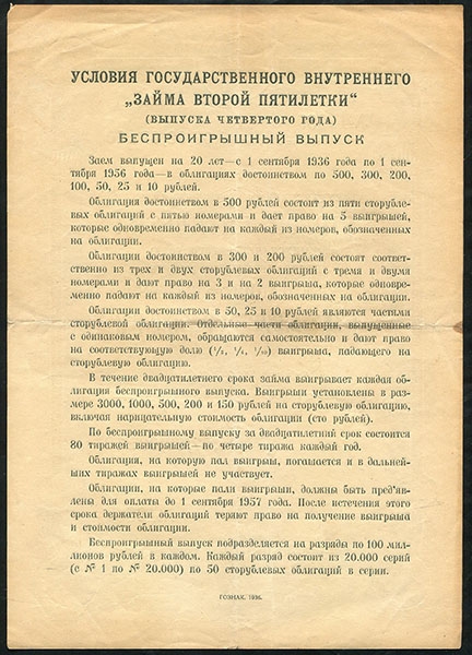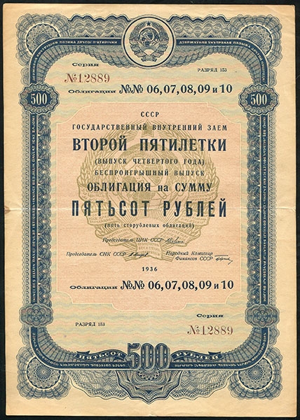 Облигация на сумму 500 рублей Государственного внутреннего займа Второй пятилетки (выпуск четвертого года), беспроигрышный выпуск. Облигации №№ 06, 07, 08, 09 и 10 серия №12889 разряд 183.