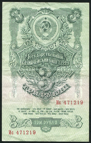 Государственный казначейский билет 3 рубля образца 1947 года, Ис 471219.16 республик.(24)
