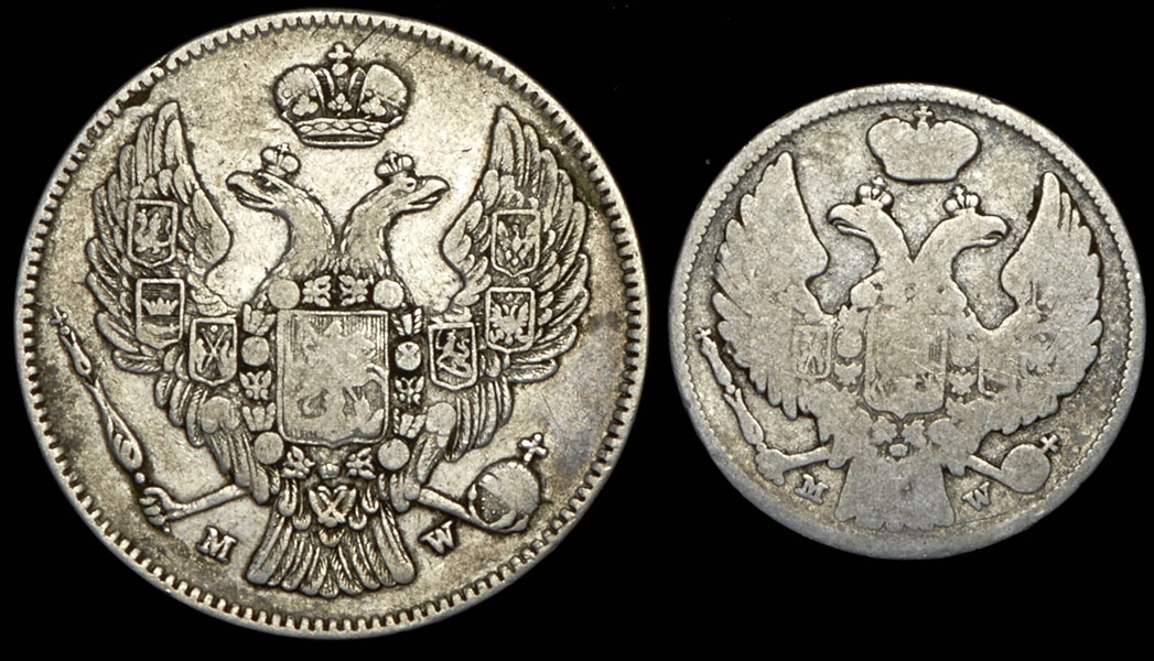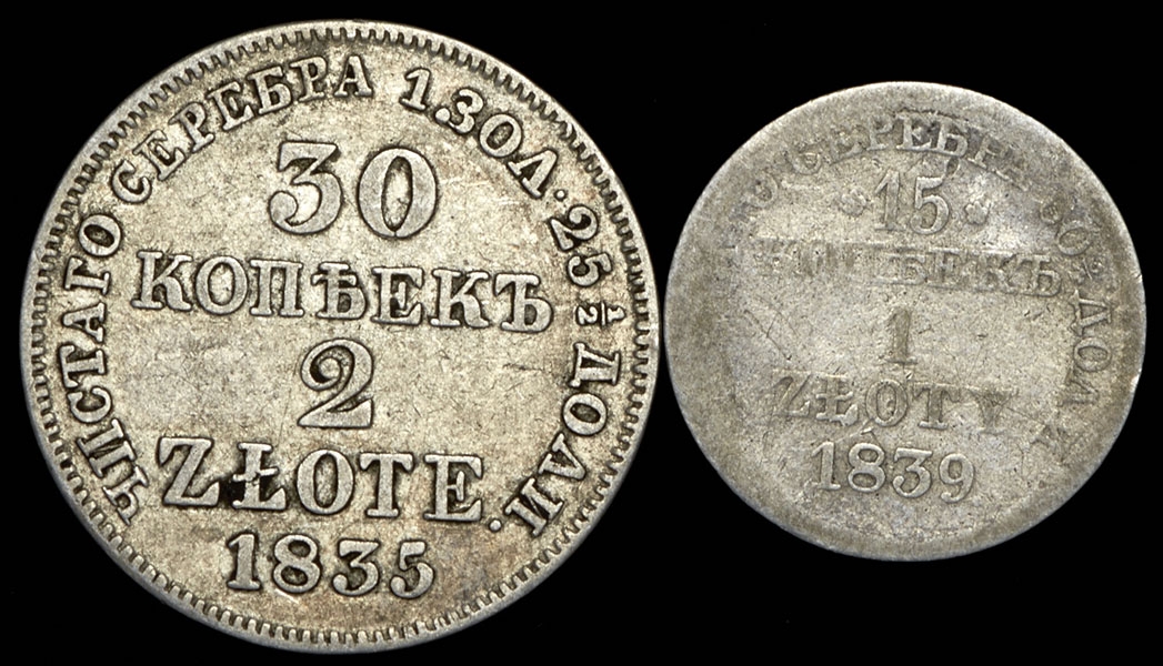 В набор вошли: 1) 30 копеек - 2 злотых 1835 г. 2) 15 копеек - 1 злотых 1839 г. Сохранность F-XF.