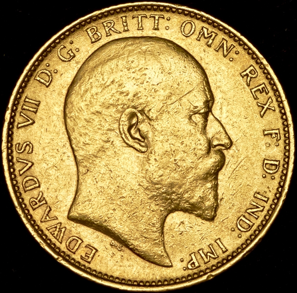 Легенда аверса: "EDWARDVS VII D:G: BRITT: OMN: REX F:D: IND: IMP:" - (EDWARDVS VII DEI GRATIA BRITTANNIARUM OMNIUM REX (FIDEI DEFENSOR INDIAE IMPERATOR) - Эдвард 7, божьей милостью, всех британских территорий король, (защитник веры, император Индии).